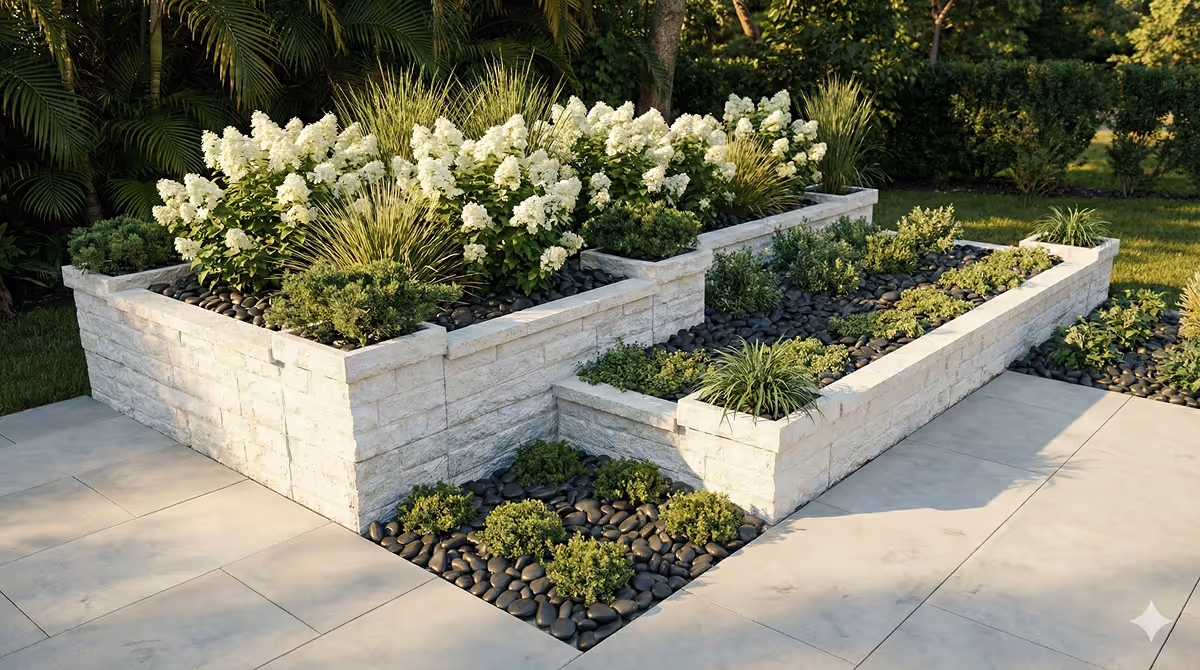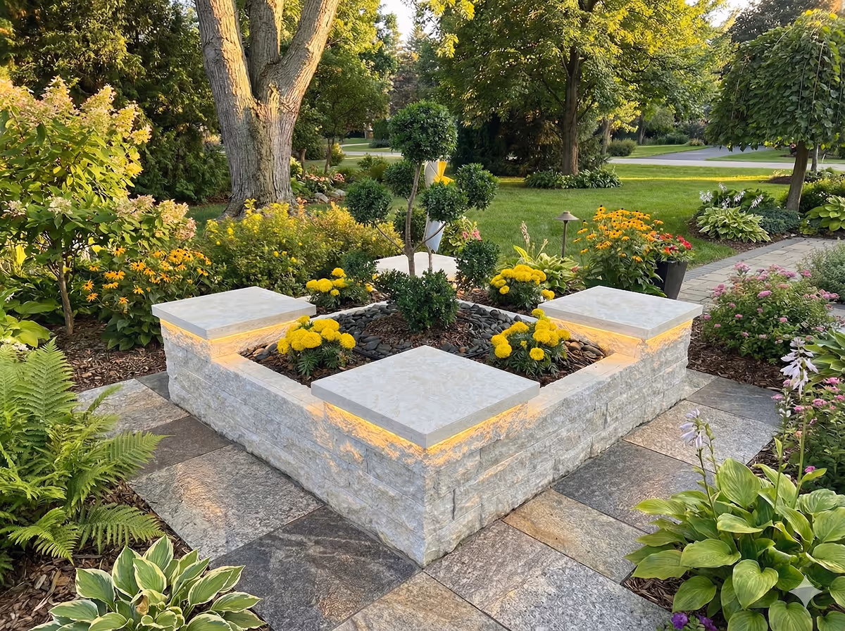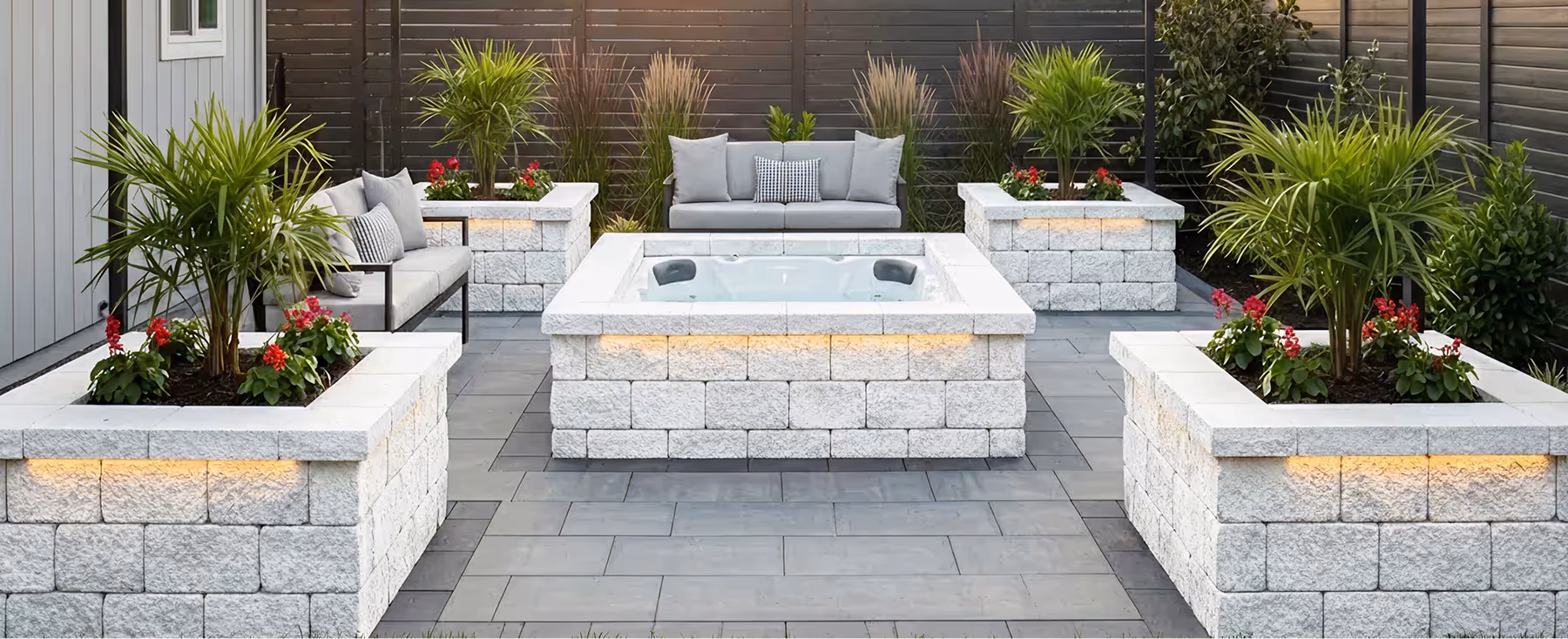 Curved cocktail bars. Elevated dining bars. Fountain surround walls. Raisedflower and garden beds. Patio benches. Outdoor utility chests. Lighted models.